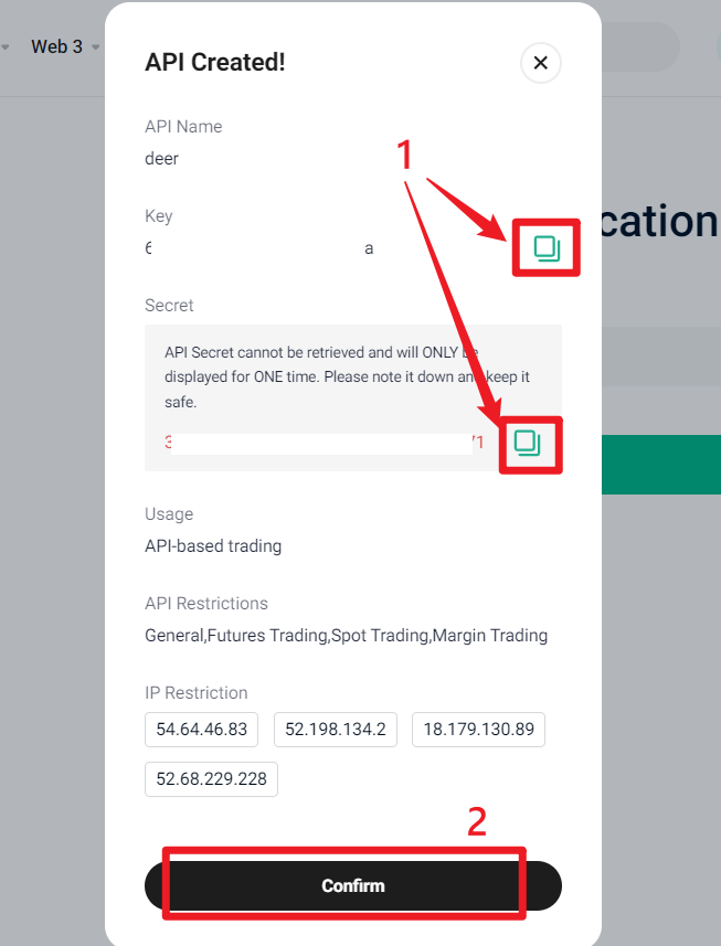 Please immediately copy the API Key and Secret Key and save them in a notepad or text file to prevent loss.